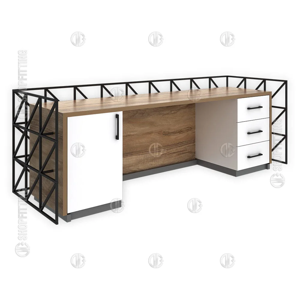 TEBA 40 Store Cash Desk is a modern, durable, and stylish reception counter designed for commercial environments that require both functionality and aesthetic appeal. With its sturdy metal frame and warm wooden paneling, the TEBA 40 Store Cash Desk brings a sophisticated industrial look to retail stores, boutiques, beauty salons, office receptions, and showrooms. The eye-catching geometric metal structure creates a distinctive visual identity, making the desk a powerful focal point in any interior setting.